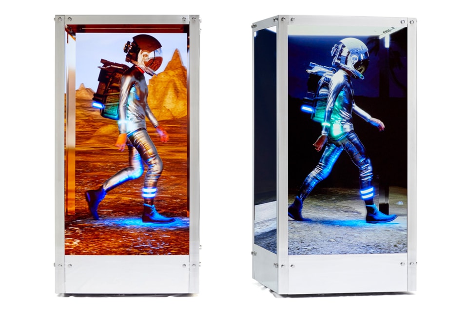 “Human One” is both a physical and digital artwork. It was described as a “kinetic video sculpture” and consists of four video screens on polished aluminum metal, a mahogany wood frame and dual media servers. The physical exhibit included a digital token. It was sold for $28.9 million at auction in November 2021.